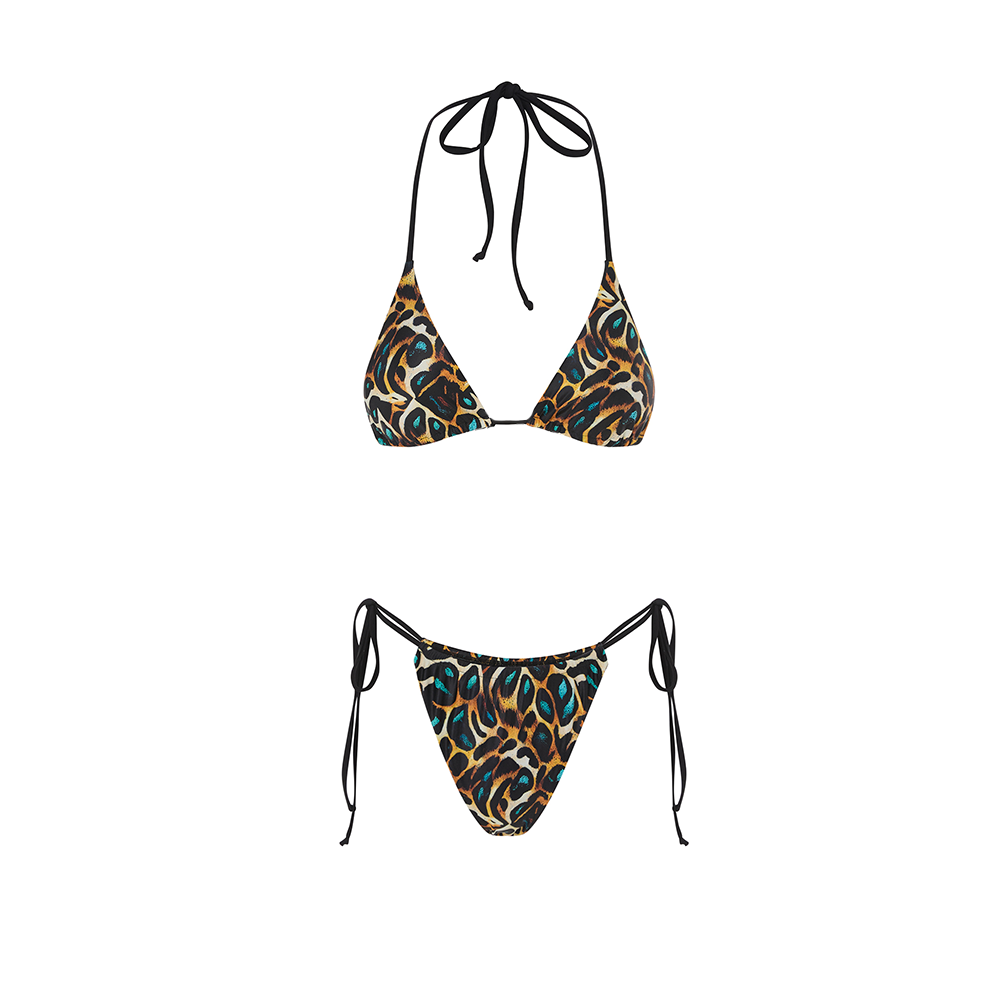 Two piece bikini set with fully adjustable triangle top with ties, removable padding, adjustable bottoms for cheeky/medium coverage, fully lined for comfort.